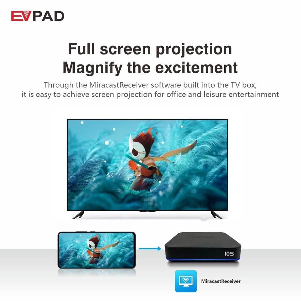 Nâng cấp Hộp TV EVPAD 10S của bạn với Chức năng chiếu toàn màn hình và đưa hoạt động giải trí, thuyết trình và hoạt động nhóm của bạn lên một tầm cao mới. Đắm chìm trong trải nghiệm tuyệt vời hơn cuộc sống, nơi mọi chi tiết và khoảnh khắc đều tỏa sáng trên màn hình lớn.