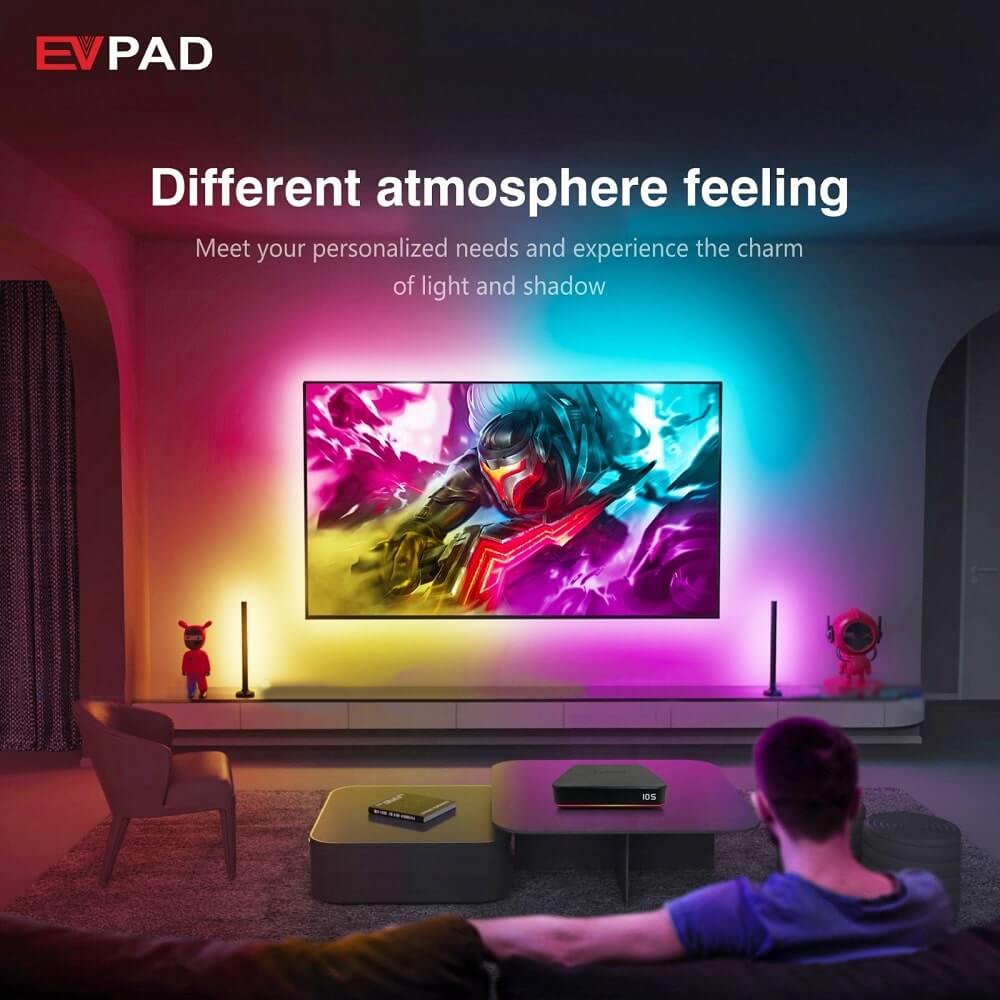 Nâng cấp Hộp TV EVPAD 10S của bạn với Hệ thống chiếu sáng xung quanh và xem trải nghiệm giải trí của bạn được nâng lên một tầm cao mới. Nâng cao trải nghiệm xem của bạn, giảm mỏi mắt và tạo tâm trạng hoàn hảo cho mọi tình huống với tính năng động và có thể tùy chỉnh này.